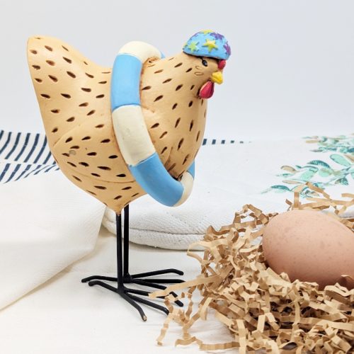 Bring a splash of fun and character to your décor with this Swimming Lifeguard Chicken Figurine. Featuring a brave little chicken in lifeguard gear, ready to dive into action, this whimsical figurine adds humour and charm to any space.