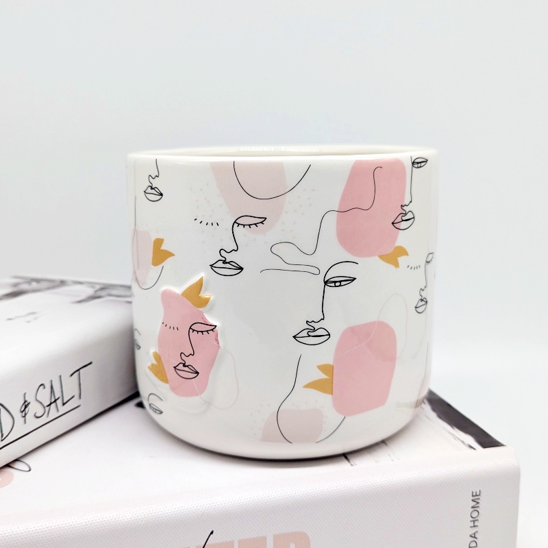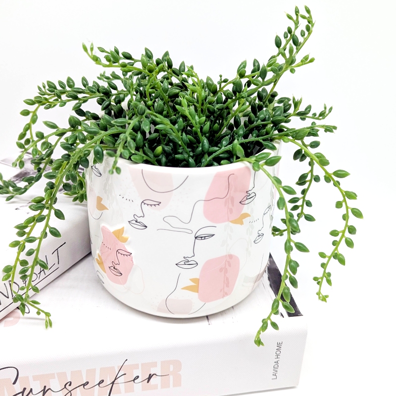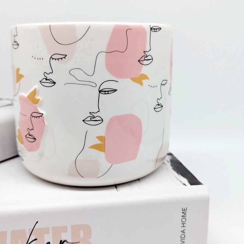- Features a ceramic planter with linear drawing face design