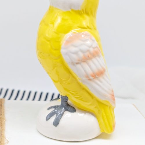 Features a ceramic vase in shape of a parrot
